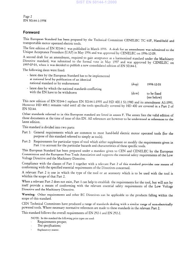 EN 50144-1:1998 is a standard published by CLC. Its full title is "Safety of hand-held electric motor operated tools - Part 1: General requirements". This standard covers: This standard applies to hand-held motor operated or magnetically driven tools intended for indoor or outdoor use designed for use by one person. This standard applies to a.c. tools having any frequency and d.c. tools. It does not apply to: battery operated tools; tools used for preparing or processing food; tools used in explosive atmospheres. This standard covers tools which can be used in a fixed support. Unless the requirement for such a support is given in a relevant Part 2, this standard alone will not be sufficient to ensure that the combination of tool and support is adequate. Tools with an electric heating element are within the scope of this standard. They should also comply with relevant Parts of EN 60335. Tools incorporating electronics components are within the scope of this standard and covered by annex B