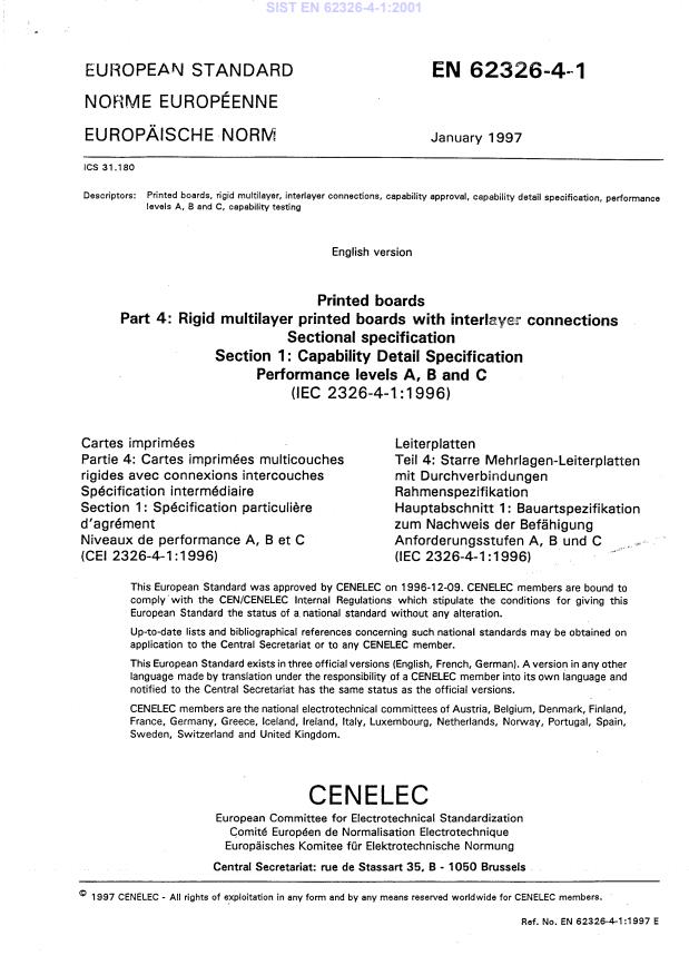 EN 62326-4-1:1997 (CLC) covers capability qualification for rigid multilayer printed boards with interlayer connections. This sectional specification (Part 4 - Section 1) defines the capability detail specification used to assess production and process capability at three performance levels: A, B and C. It specifies the capability-qualifying component, the characteristics to be tested, the appropriate test methods and environmental/conditioning requirements, and the pass/fail requirements for capability demonstration.