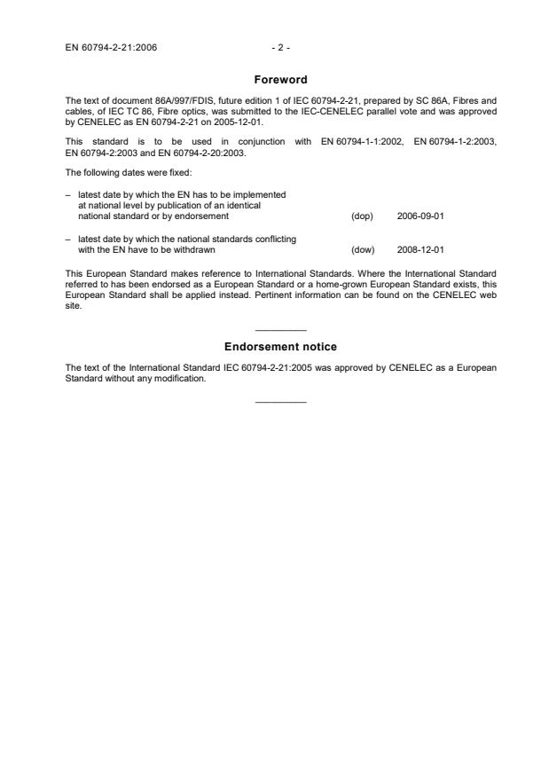 The text of the International Standard IEC 60794-2-21:2005 was approved by CENELEC as a European