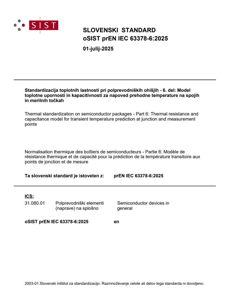 Standardizacija toplotnih lastnosti pri polprevodniških ohišjih - 6. del: Model toplotne upornosti in kapacitivnosti za napoved prehodne temperature na spojih in merilnih točkah (IEC 63378-6:2026)