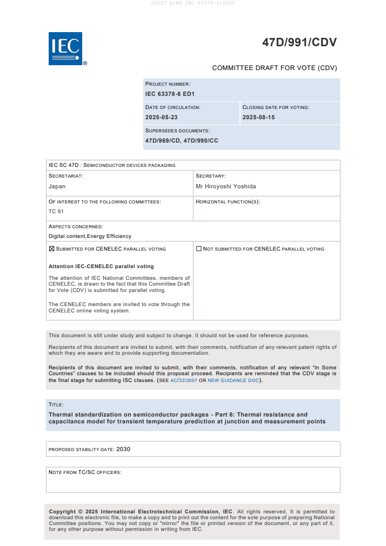 EN IEC 63378-6:2026 is a draft published by CLC. Its full title is "Thermal standardization on semiconductor packages - Part 6: Thermal resistance and capacitance model for transient temperature prediction at junction and measurement points". This standard covers: IEC 63378-6:2026 specifies a thermal resistance and capacitance model for semiconductor packages. This model is named the digital transformation using thermal resistance and capacitance (DXRC) model. It predicts transient temperature at junction and measurement points. This document applies to semiconductor packages such as TO-252, TO-263, and HSOP. It supports single chip packages dissipated heat from single package surface.