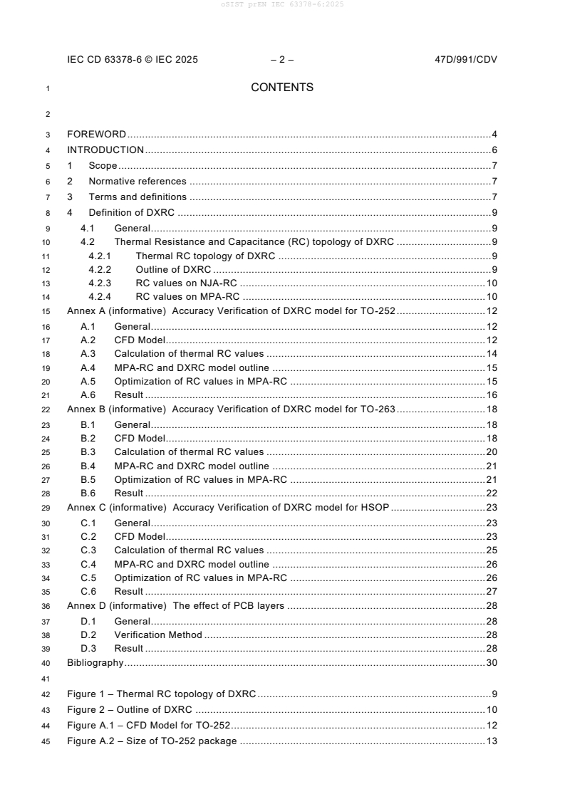 prEN IEC 63378-6:2025 defines the Digital Transformation using thermal Resistance and Capacitance (DXRC) model for predicting transient temperatures at junction and measurement points in semiconductor packages. The document targets common package families such as TO-252, TO-263 and HSOP and supports single-chip packages where heat is dissipated from a single package surface. The standard is part of the IEC 63378-6 series and establishes a compact thermal resistance and capacitance (RC) topology for transient thermal analysis.