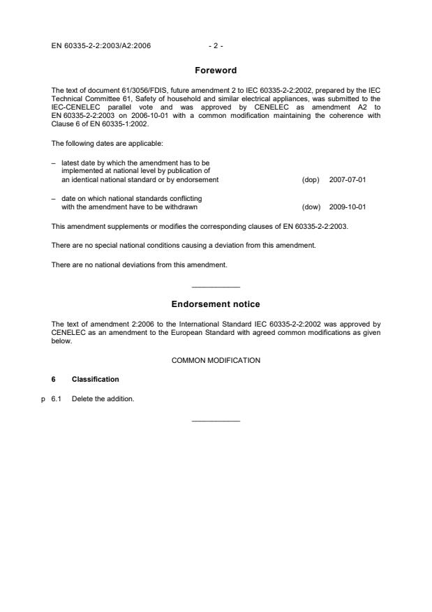 This amendment A2 modifies the European Standard EN 60335-2-2:2003; it was approved by CENELEC on