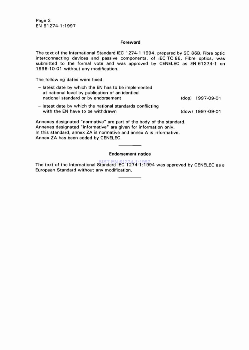 EN 61274-1:1997 is a standard published by CLC. Its full title is "Fibre optic adaptors - Part 1: Generic specification". This standard covers: Relates to individual fibre optic adaptors such as: -adaptors for connecting a plug connector to an identical type of plug connector; -adaptors for connecting one type of plug connector to a different type of plug connector; -adaptors for connecting a fibre optic connector to their optical devices such as LEDs, switches, etc. The specification includes: -adaptor requirements; -quality assessment procedures.