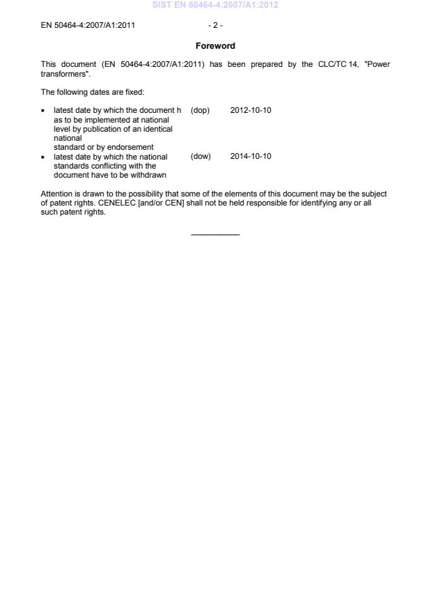 This amendment A1 modifies the European Standard EN 50464-4:2007; it was approved by CENELEC on 2011-
