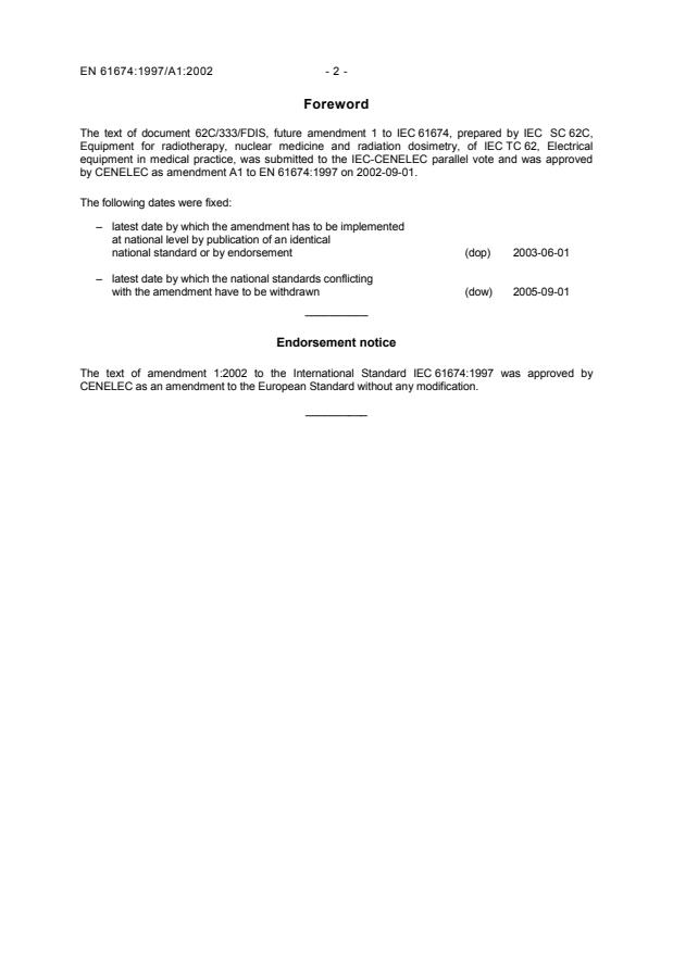 This amendment A1 modifies the European Standard EN 61674:1997; it was approved by CENELEC on