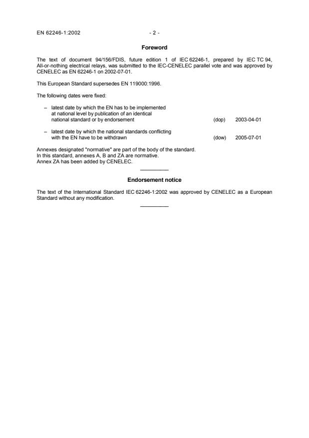 EN 62246-1:2002 has the following relationships with other standards: It is inter standard links to EN 119000:1996, EN 62246-1:2011, EN 60068-2-17:1994, EN 60068-2-2:1993/A2:1994, EN 60317-1:1994/A2:1998, EN 60068-2-7:1993, EN 60068-1:1994, EN 60068-2-21:1999, EN 61810-1:1998, EN 60068-2-6:1995, HD 323.2.3 S2:1987, EN 60068-2-29:1993, EN 60068-2-27:1993, HD 60027-1:2004, EN 60317-1:1994. Understanding these relationships helps ensure you are using the most current and applicable version of the standard.