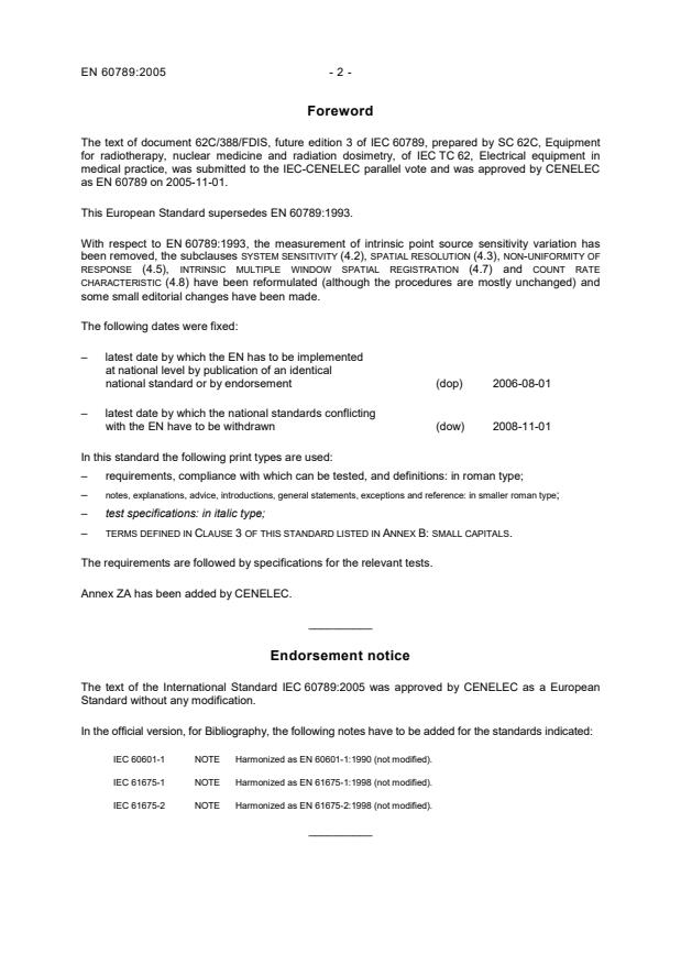 2008-11-01 In this standard the following print types are used: – requirements, compliance with which can be tested, and definitions: in roman type; – notes, explanations, advice, introductions, general statements, exceptions and reference: in smaller roman type; – test specifications: in italic type; – TERMS DEFINED IN CLAUSE 3 OF THIS STANDARD LISTED IN ANNEX B: SMALL CAPITALS. The requirements are followed by specifications for the relevant tests. Annex ZA has been added by CENELEC. __________ Endorsement notice The text of the International Standard IEC 60789:2005 was approved by CENELEC as a European Standard without any modification. In the official version, for Bibliography, the following notes have to be added for the standards indicated: