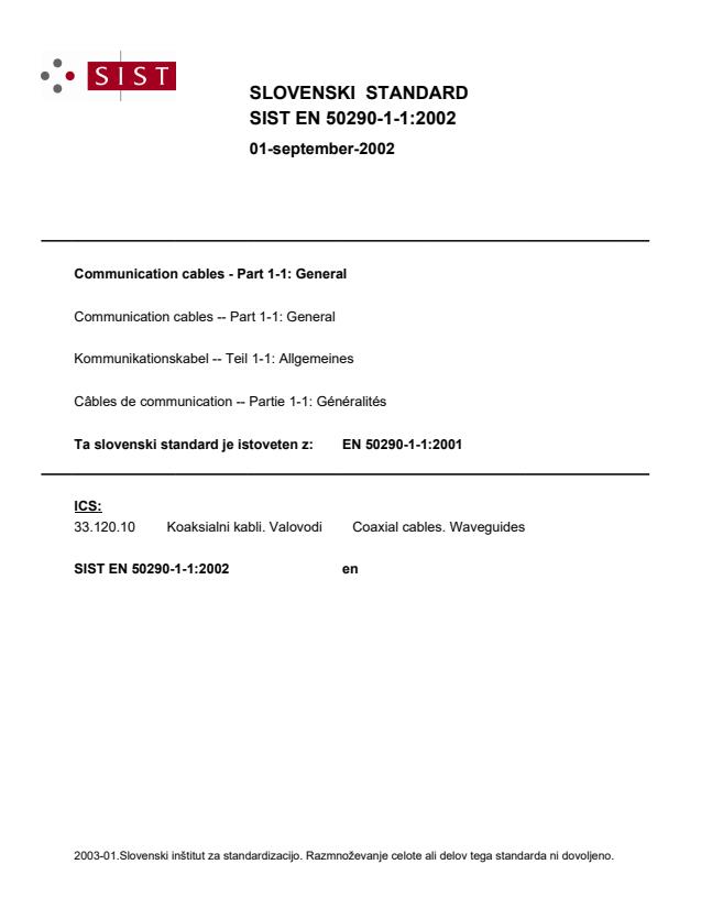 Ta slovenski standard je istoveten z: EN 50290-1-1:2001
