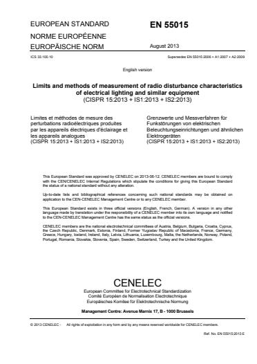 EN 55015:2013 is a standard published by CLC. Its full title is "Limits and methods of measurement of radio disturbance characteristics of electrical lighting and similar equipment". This standard covers: CISPR 15:2013 applies to the emission (radiated and conducted) of radiofrequency disturbances from: - all lighting equipment with a primary function of generating and/or distributing light intended for illumination purposes, and intended either for connection to the low voltage electricity supply or for battery operation; - the lighting part of multi-function equipment where one of the primary functions of this is illumination; - independent auxiliaries exclusively for use with lighting equipment; - UV and IR radiation equipment; - neon advertising signs; - street/flood lighting intended for outdoor use; - and transport lighting (installed in buses and trains). Excluded from the scope of this standard are: - lighting equipment operating in the ISM frequency bands (as defined in Resolution 63 (1979) of the ITU Radio Regulation); - lighting equipment for aircraft and airports; - and apparatus for which the electromagnetic compatibility requirements in the radio-frequency range are explicitly formulated in other CISPR standards. The frequency range covered is 9 kHz to 400 GHz. This eighth edition cancels and replaces the seventh edition published in 2005, its Amendment 1 (2006) and Amendment 2 (2008). It is a technical revision. This edition includes the following significant technical changes with respect to the previous edition: - inclusion of LED light sources and luminaires, clarification of test supply voltage and frequency, and improvements to clause 5 relating to the application of limits to the various types of lighting equipment covered under the scope of CISPR 15; - introduction of requirements for flashing type emergency lighting luminaires utilizing xenon lamps; - introduction of requirements for neon and other advertising signs; - and clarification of the requirement for radiated disturbances between 30 MHz and 300 MHz in case the operating frequency of the light source is below 100 Hz.