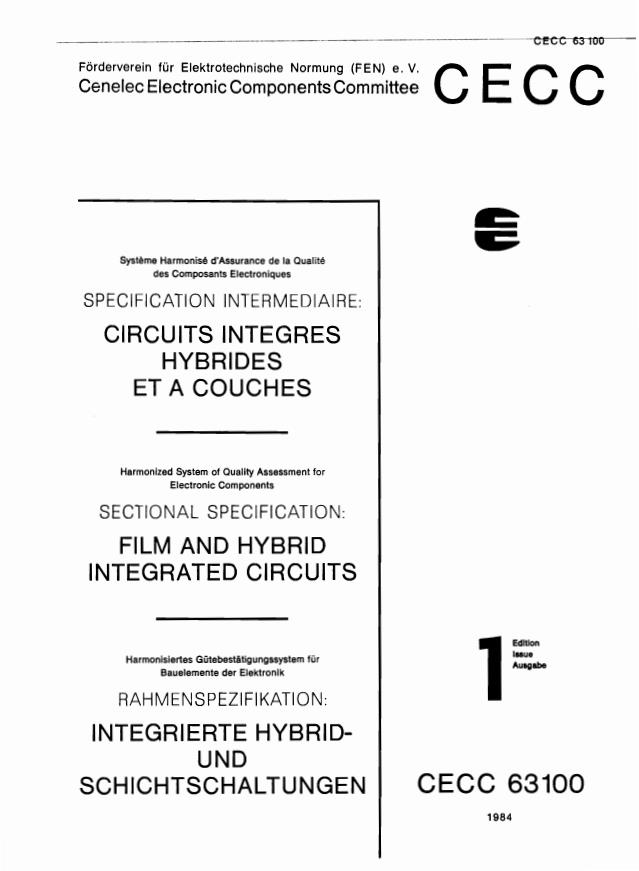 EN 163100:1991 is a standard published by CLC. Its full title is "Sectional Specification: Film and hybrid integrated circuits". This standard covers: This sectional specification applies to F&HICs manufactured as catalogue products or as custom built products using thick film techniques and whose quality is assessed on the basis of qualification approval. It presents preferred values for ratings and characteristics. It selects from CECC 63 000 the appropriate methods of test and gives generam performance requirements, to be used in detail specifications for F&HICs derived from this specification. Passive networks can be qualified to this specification or to alternative specifications, when introduced. For resistor networks, see specification CECC 64 100.