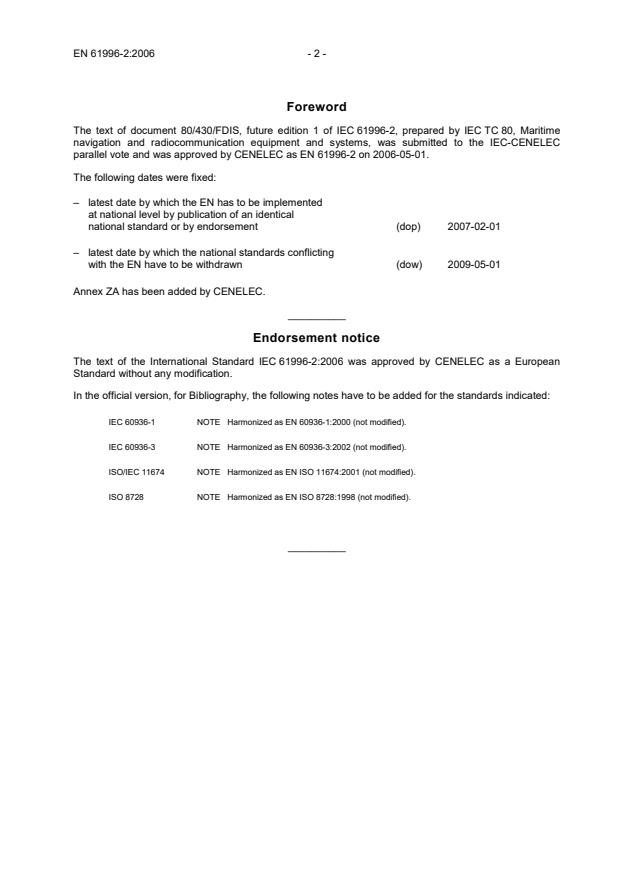 EN 61996-2:2006 has the following relationships with other standards: It is inter standard links to EN 61996-2:2008, EN 60945:2002, EN 61162-2:1998, EN 60268-16:2003, EN 61162-1:2000, EN 61672-1:2003, EN 61260:1995, EN 60068-2-27:1993, EN 61162-1:2016. Understanding these relationships helps ensure you are using the most current and applicable version of the standard.