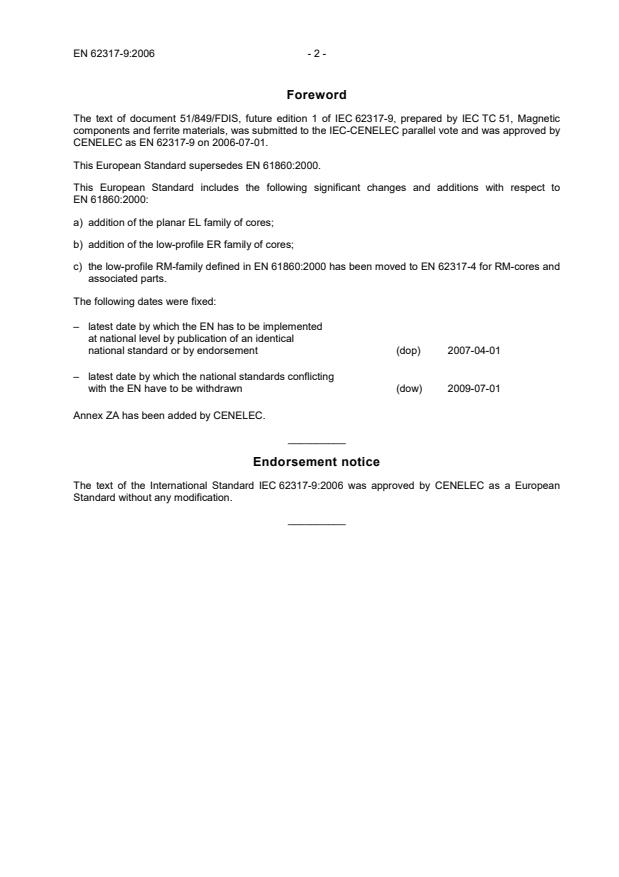- 2 - Foreword The text of document 51/849/FDIS, future edition 1 of IEC 62317-9, prepared by IEC TC 51, Magnetic components and ferrite materials, was submitted to the IEC-CENELEC parallel vote and was approved by CENELEC as EN 62317-9 on 2006-07-01. This European Standard supersedes EN 61860:2000. This European Standard includes the following significant changes and additions with respect to EN 61860:2000: a)