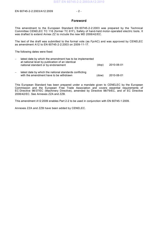This amendment A12 modifies the European Standard EN 60745-2-2:2003; it was approved by CENELEC on