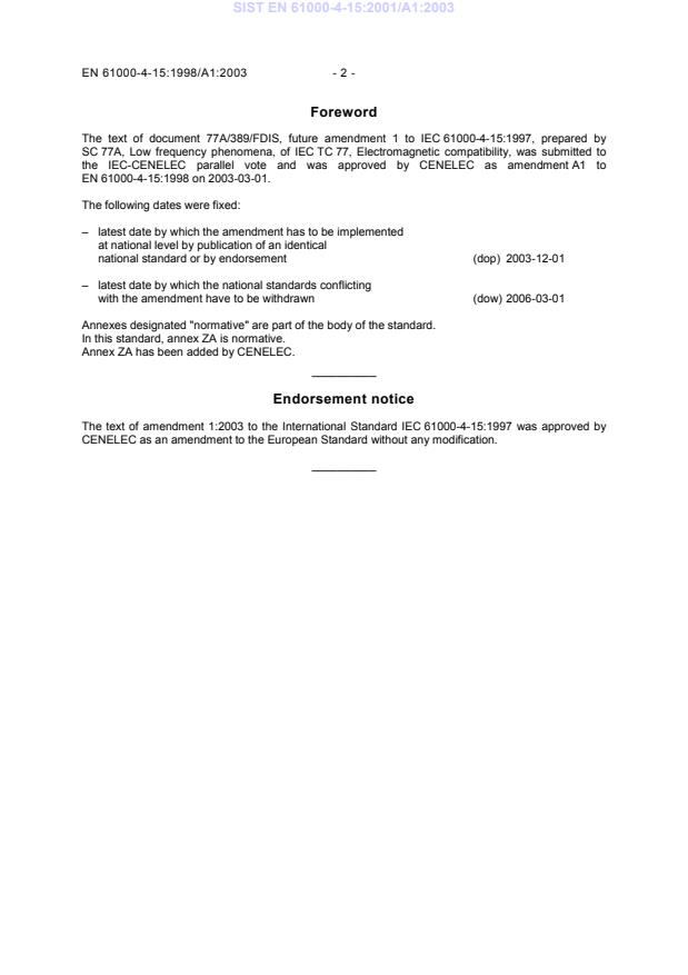 This amendment A1 modifies the European Standard EN 61000-4-15:1998; it was approved by
