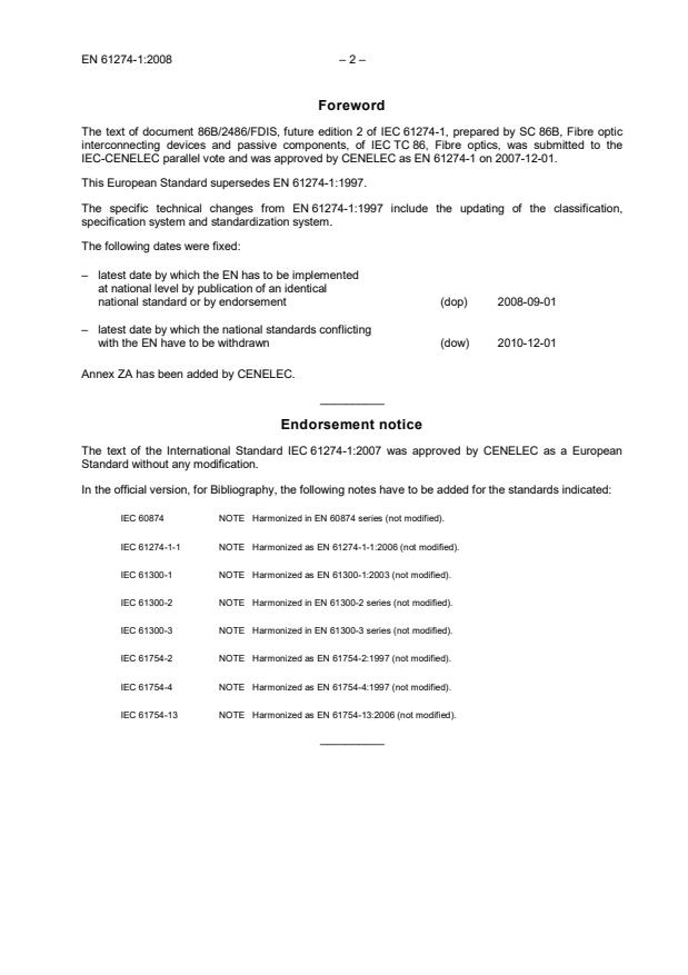 – 2 – Foreword The text of document 86B/2486/FDIS, future edition 2 of IEC 61274-1, prepared by SC 86B, Fibre optic interconnecting devices and passive components, of IEC TC 86, Fibre optics, was submitted to the IEC-CENELEC parallel vote and was approved by CENELEC as EN 61274-1 on 2007-12-01. This European Standard supersedes EN 61274-1:1997. The specific technical changes from EN 61274-1:1997 include the updating of the classification, specification system and standardization system. The following dates were fixed: – latest date by which the EN has to be implemented