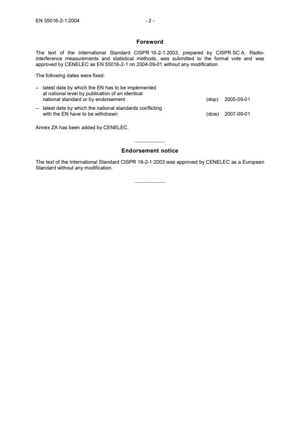 (dow) 2007-09-01 Annex ZA has been added by CENELEC. __________ Endorsement notice The text of the International Standard CISPR 16-2-1:2003 was approved by CENELEC as a European Standard without any modification. __________