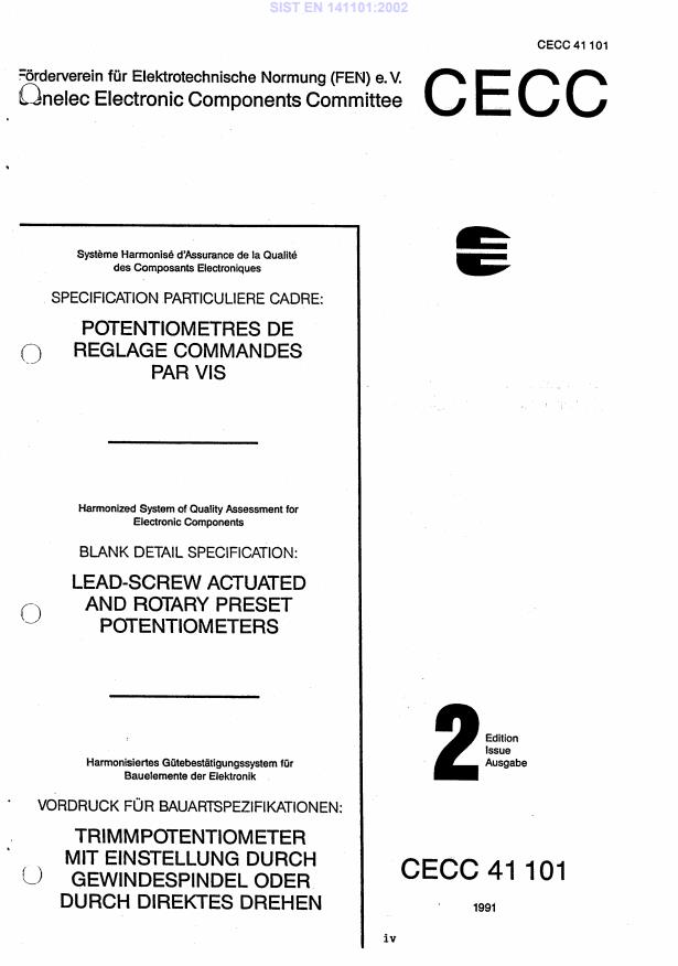EN 141101:1992 is a standard published by CLC. Its full title is "Blank Detail Specification: Lead-screw actuated and rotary preset potentiometers". This standard covers: Supersedes CECC 41 101 Issue 2 * CECC WG 4B work handled by SR 40 * D138/C031: Withdrawn with immediate effect (standstill maintained)