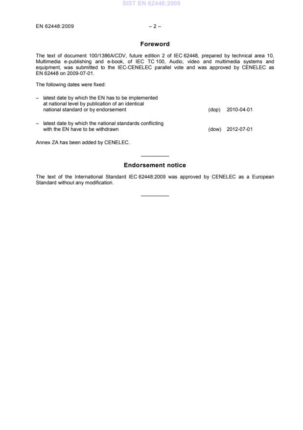 EN 62448:2009 is a standard published by CLC. Its full title is "Multimedia systems and equipment - Multimedia E-publishing and E-books - Generic format for E-publishing". This standard covers: 2019-07-18 PC: withdrawn as a result of the exemption from // vote Project transferred to new CLC/TC 100X