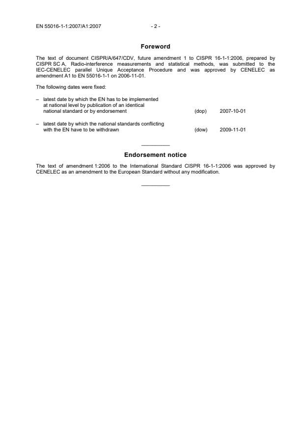 This amendment A1 modifies the European Standard EN 55016-1-1:2007; it was approved by CENELEC on