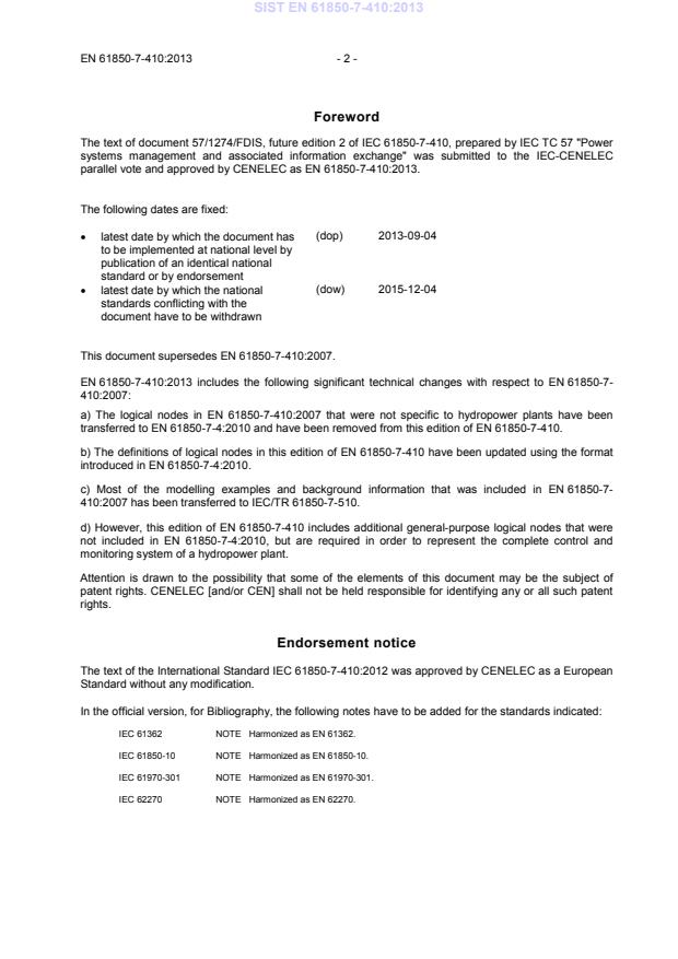 EN 61850-7-410:2013 (IEC 61850-7-410:2012, Edition 2) is the part of the IEC 61850 family that specifies additional data classes, logical nodes and data objects required to apply IEC 61850 in hydroelectric power plants. It defines the basic communication structure for monitoring and control of hydropower units, dams, gates, turbines, governors, protection and related mechanical equipment. This European (CENELEC) / Slovenian (SIST) adoption updates hydropower-specific modeling and adds general-purpose logical nodes needed to represent a complete hydropower control and monitoring system.