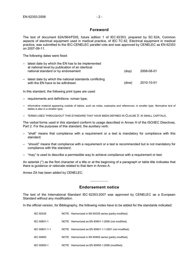 Annex ZA has been added by CENELEC. __________ Endorsement notice The text of the International Standard IEC 62353:2007 was approved by CENELEC as a European Standard without any modification. In the official version, for Bibliography, the following notes have to be added for the standards indicated: IEC 60335 NOTE