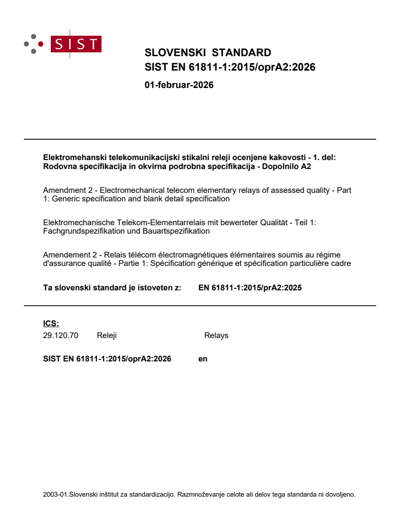 EN 61811-1:2015/prA2:2025 (Amendment 2) establishes updated requirements for electromechanical telecom elementary relays of assessed quality. Developed by CLC and based on IEC standards, this amendment addresses generic specifications and provides a blank detail specification for use across telecommunications and related sectors. The standard is fundamental for manufacturers, engineers, and quality assurance teams who design, specify, or test relays used in telecom and broader industrial applications.