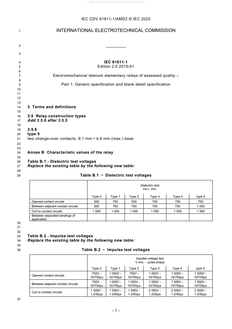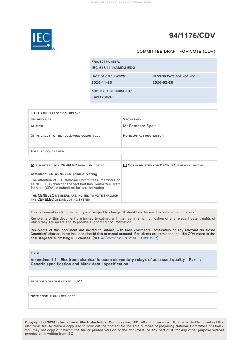 EN 61811-1:2015/prA2:2025 serves as a critical update for organizations involved in the design, specification, and quality assurance of electromechanical telecom relays. By adopting these standards, stakeholders ensure improved interoperability, product reliability, and compliance with European and international requirements.
