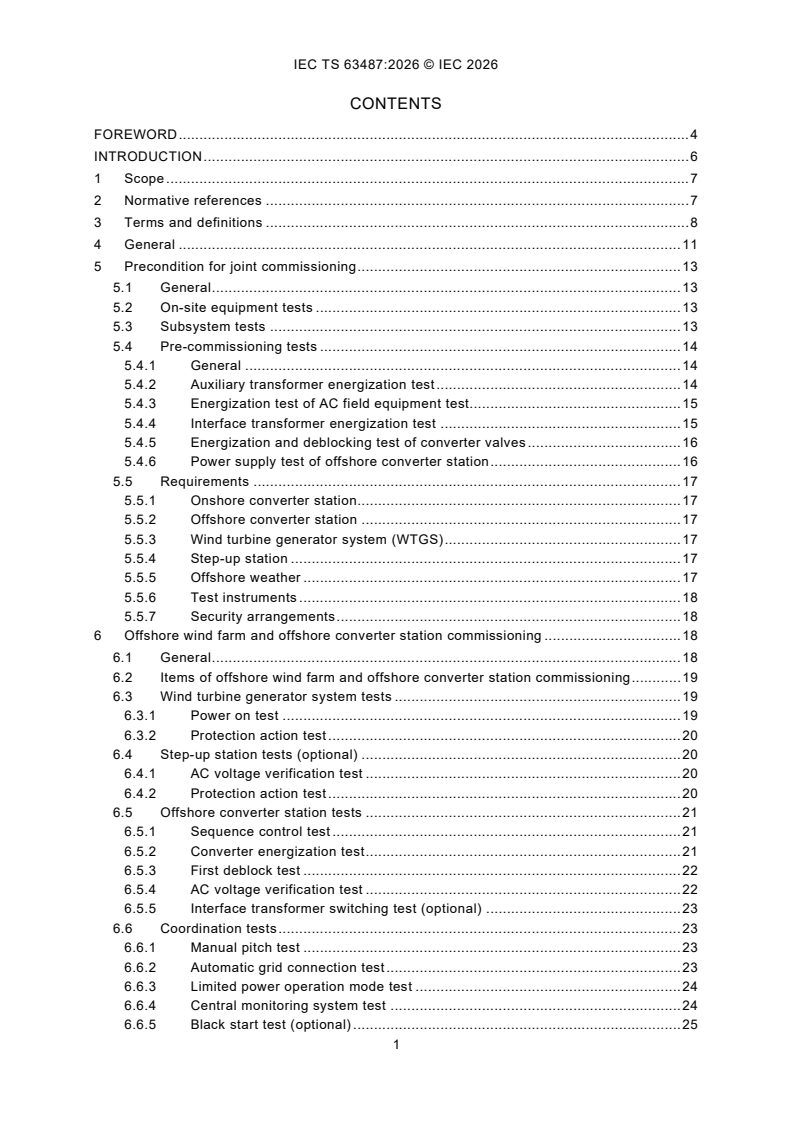 IEC TS 63487:2026 is a technical specification published by the International Electrotechnical Commission (IEC). Its full title is "Joint commissioning for grid-connection of offshore wind farms using VSC HVDC transmission". This standard covers: IEC TS 63487:2026 serves as a specification for the joint commissioning of grid-connection of offshore wind farms (GCOWF) using the voltage source converter based high voltage direct current (VSC HVDC) transmission system. This document provides the technical specification on the commissioning precondition, objectives, procedures, items, methods and requirements of grid-connection of offshore wind farms using the VSC HVDC power transmission, particularly focusing on the special test items of offshore wind farms. This document covers the commissioning of offshore wind farms, testing of onshore DC energy dissipation device, special test items for transmission test, coordination function testing among VSC HVDC, DC energy dissipation device, offshore wind farm and automatic generation control (AGC). However, the conventional commissioning test items of the onshore VSC HVDC system are out of scope.