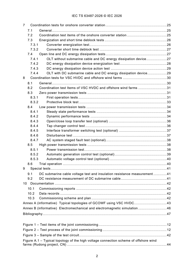 IEC TS 63487:2026 serves as a specification for the joint commissioning of grid-connection of offshore wind farms (GCOWF) using the voltage source converter based high voltage direct current (VSC HVDC) transmission system. This document provides the technical specification on the commissioning precondition, objectives, procedures, items, methods and requirements of grid-connection of offshore wind farms using the VSC HVDC power transmission, particularly focusing on the special test items of offshore wind farms. This document covers the commissioning of offshore wind farms, testing of onshore DC energy dissipation device, special test items for transmission test, coordination function testing among VSC HVDC, DC energy dissipation device, offshore wind farm and automatic generation control (AGC). However, the conventional commissioning test items of the onshore VSC HVDC system are out of scope.