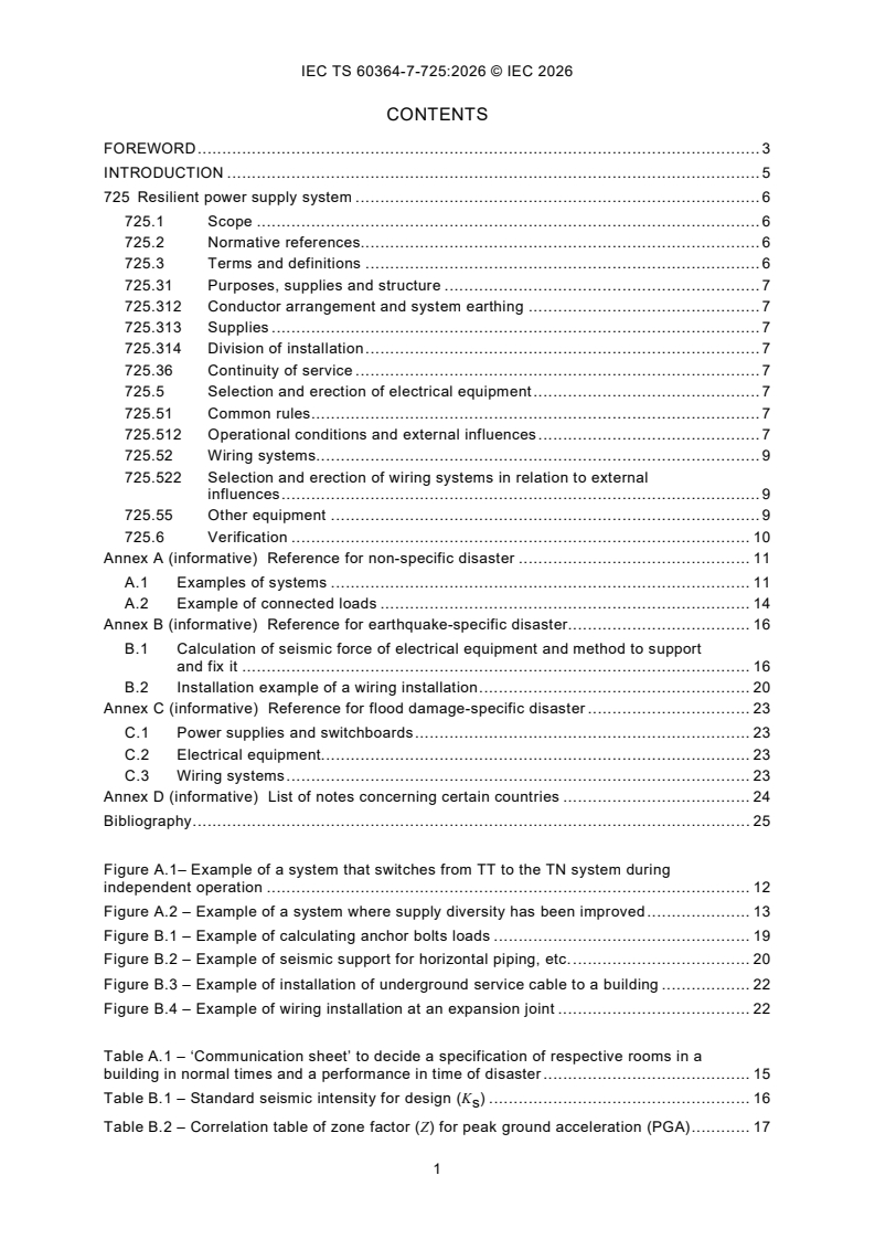 IEC TS 60364-7-725:2026 is a technical specification published by the International Electrotechnical Commission (IEC). Its full title is "Low-voltage electrical installations - Part 7-725: Requirements for special installations or locations - Resilient power supply system". This standard covers: IEC TS 60364-7-725:2026 provides additional requirements for the design, erection and verification of electrical installations applicable for resilient power supply systems that must be operational in a time of disaster. It specifies additional requirements for – generating sets, – a circuit concerning external generating sets, and – circuits of an installation to be supplied so as to prevent or limit the effects of a natural disaster such as – earthquake, – flood damage, or – wind hazard (e.g. tropical cyclone such as hurricane, typhoon).