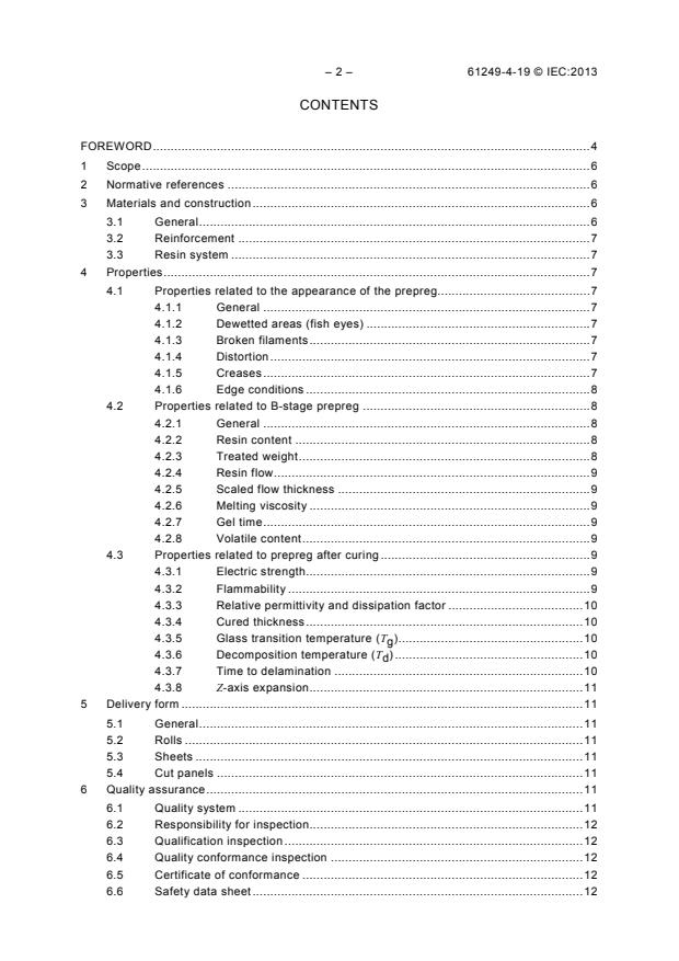 IEC 61249-4-19:2013 gives requirements for properties of prepreg that is mainly intended to be used as bonding sheets in connection with laminates according to IEC 61249-2-40 when manufacturing multilayer boards according to IEC 62326-4. Multilayer boards comprised of these materials are suitable for lead-free assembly processes. This material may be also used to bond other types of laminates. Prepreg according to this standard is of defined flammability (vertical burning test). The flammability rating on fully cured prepreg is achieved through the use of non-halogenated fire retardants contained as an integral part of the polymeric structure. After curing of the prepreg according to the supplier's instructions, the glass transition temperature is defined to be 170 °C minimum.