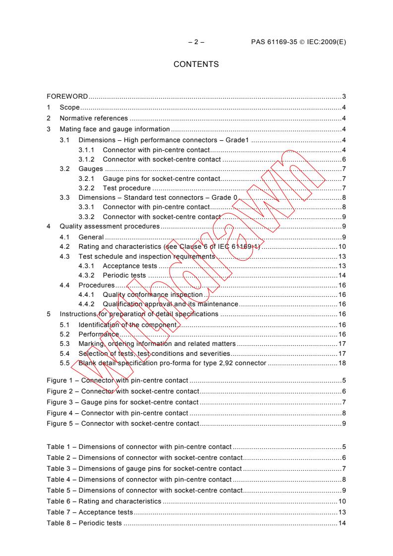 IEC/PAS 61169-35:2009(E) is a sectional specification providing information and rules for preparation of detail specification of 2,92 series R.F coaxial connectors together with the pro forma blank detail specification. 2,92 series coaxial connectors with characteristic impedance 50 ohm, 2,92 mm inner diameter of outer conductor and screw coupling, are used for millimeter wave applications, connecting with RF cables or microstrips. The operating frequency limit is up to 40 GHz.