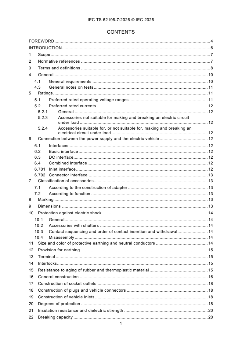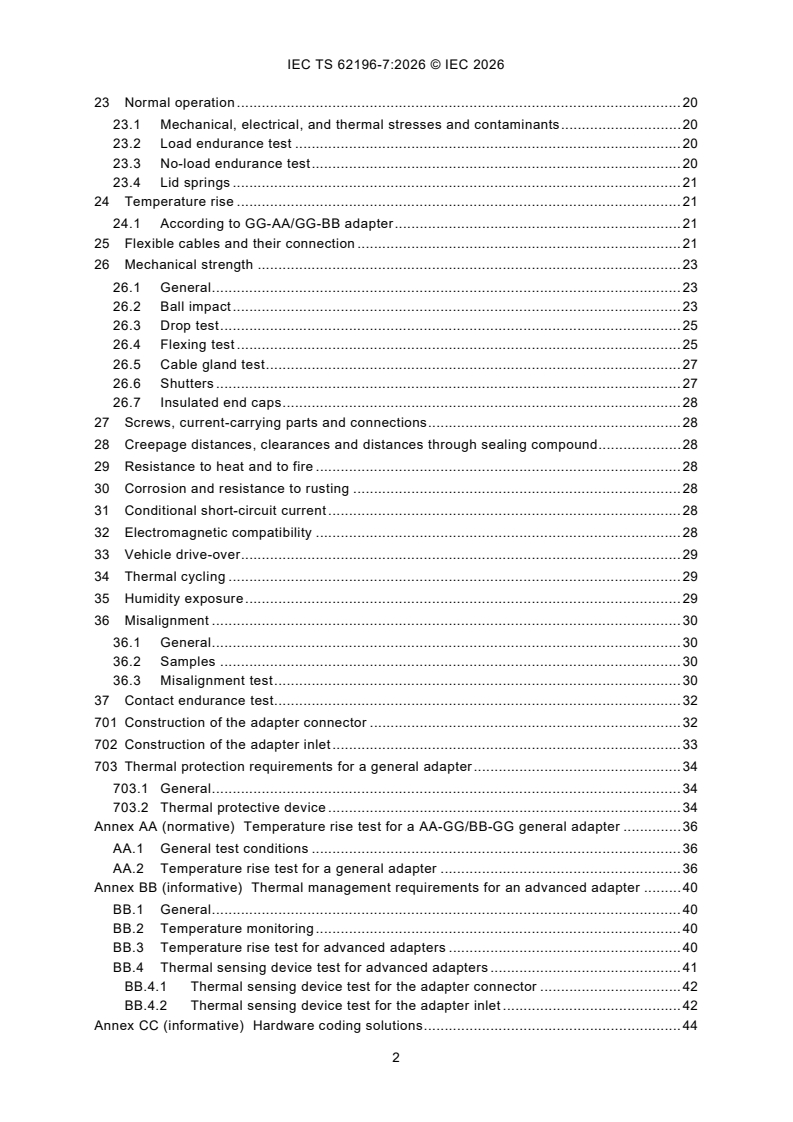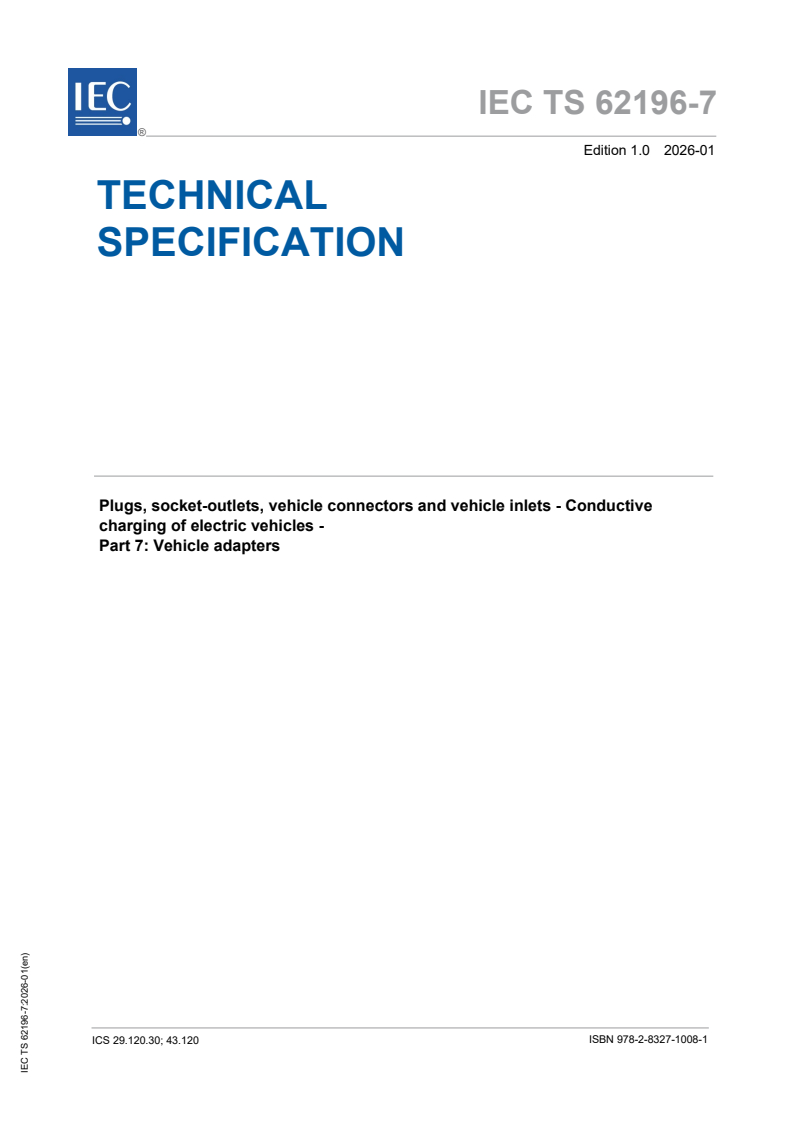 IEC TS 62196-7:2026 specifies the safety, interoperability, compatibility requirements and the configuration standard sheets for DC charging vehicle adapters