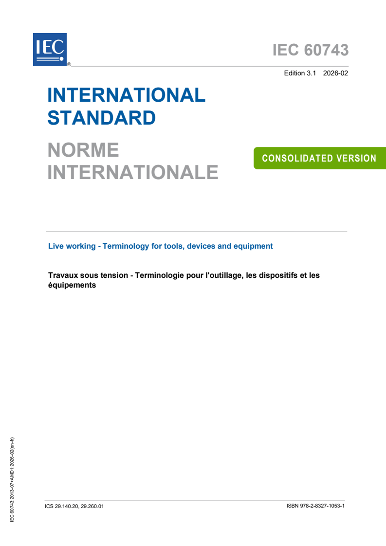 IEC 60743:2013+AMD1:2026 CSV - Live working - Terminology for tools, devices and equipment Released:4. 02. 2026 Isbn:9782832710531