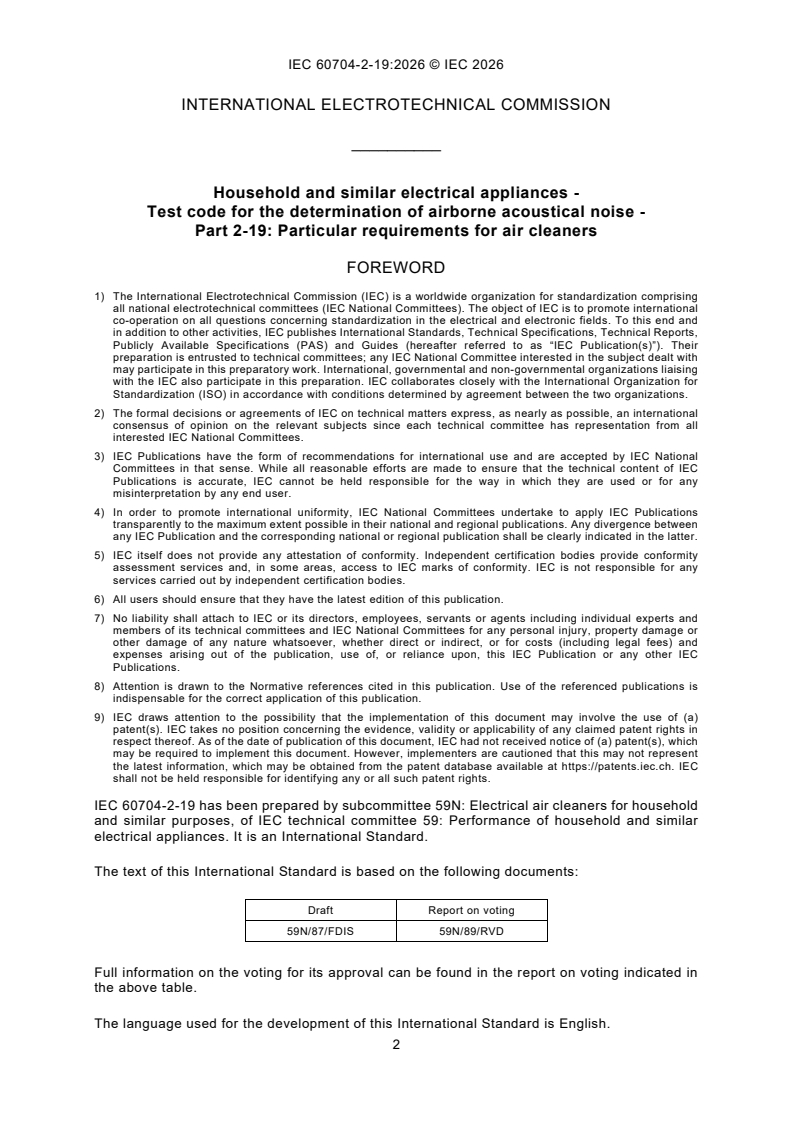 IEC 60704-2-19:2026 is a standard published by the International Electrotechnical Commission (IEC). Its full title is "Household and similar electrical appliances - Test code for the determination of airborne acoustical noise - Part 2-19: Particular requirements for air cleaners". This standard covers: IEC 60704-2-19:2026 applies to stationary freestanding and wall-mounted air cleaners for domestic and similar use, supplied from mains, d.c. voltage not exceeding 48 V or batteries. This document includes combination products, where air cleaning is combined with for example humidification, but can be used only for the air cleaning function. This Part 2-19 is intended to be used in conjunction with IEC 60704-1:2021, Household and similar electrical appliances - Test code for the determination of airborne acoustical noise - Part 1: General requirements.