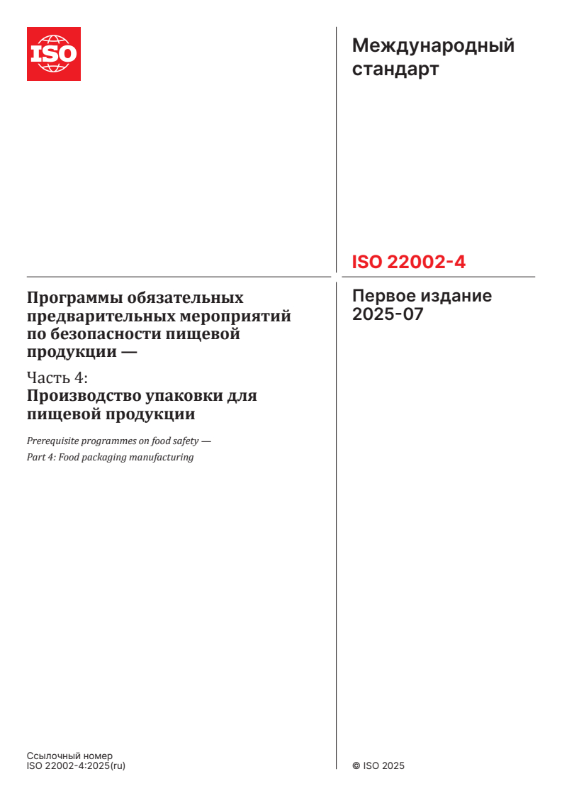 ISO 22002-4:2025 - Prerequisite programmes on food safety — Part 4: Food packaging manufacturing Released:7/29/2025