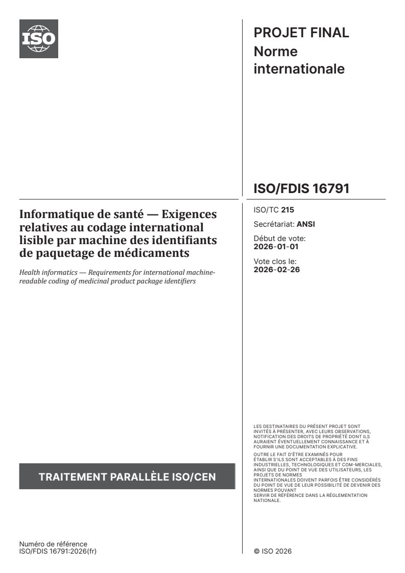 ISO/FDIS 16791 - Informatique de santé — Exigences relatives au codage international lisible par machine des identifiants de paquetage de médicaments Released:21. 01. 2026