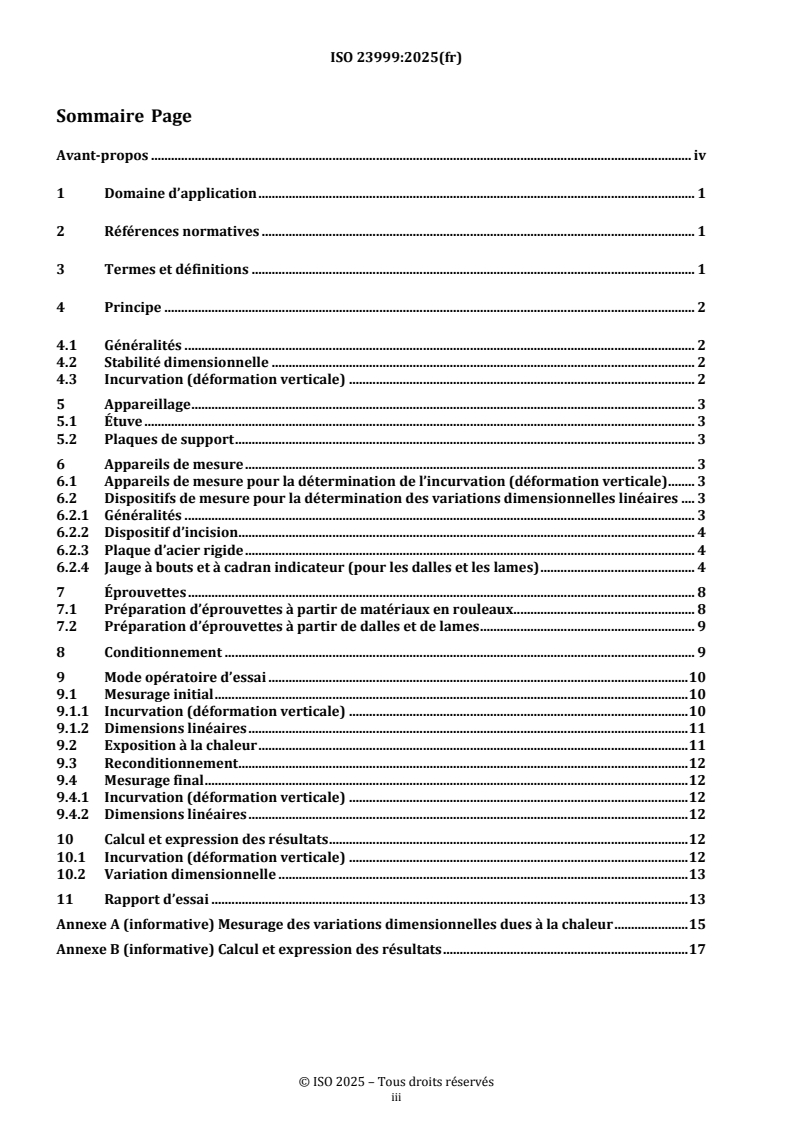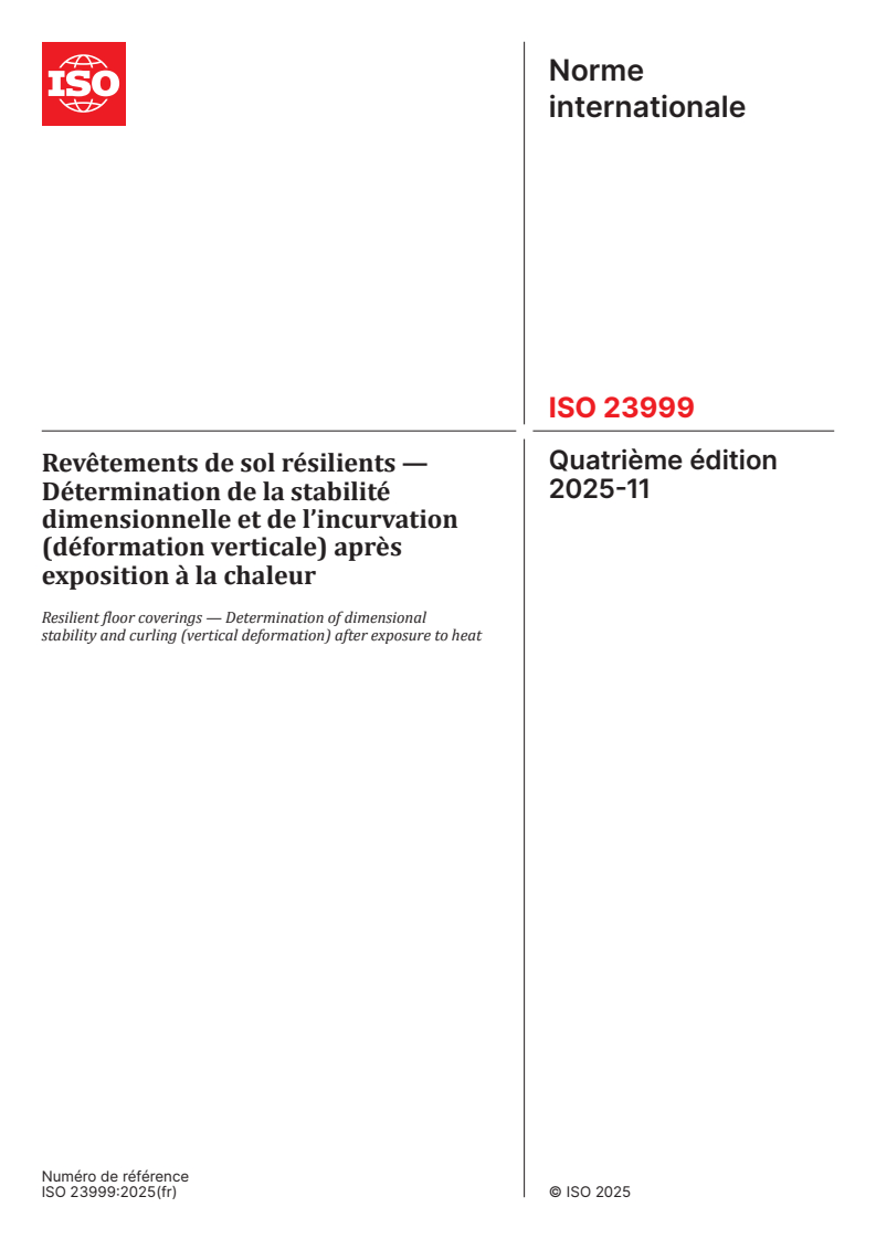 ISO 23999:2025 - Revêtements de sol résilients — Détermination de la stabilité dimensionnelle et de l’incurvation (déformation verticale) après exposition à la chaleur Released:29. 01. 2026