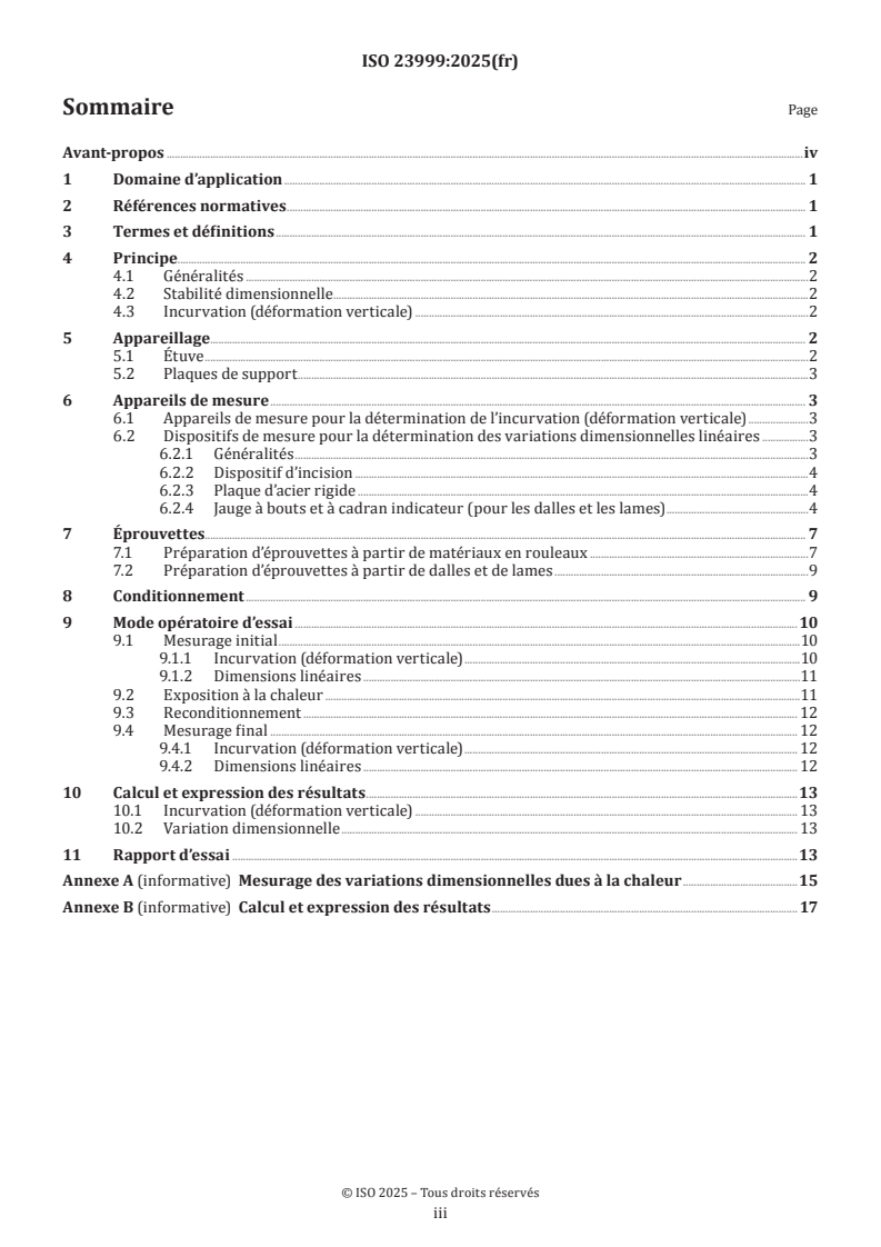 Keywords: ISO 23999:2025, resilient floor coverings, dimensional stability, curling, vertical deformation, heat exposure, oven requirements, block and dial gauge, optical bench, flooring test methods.