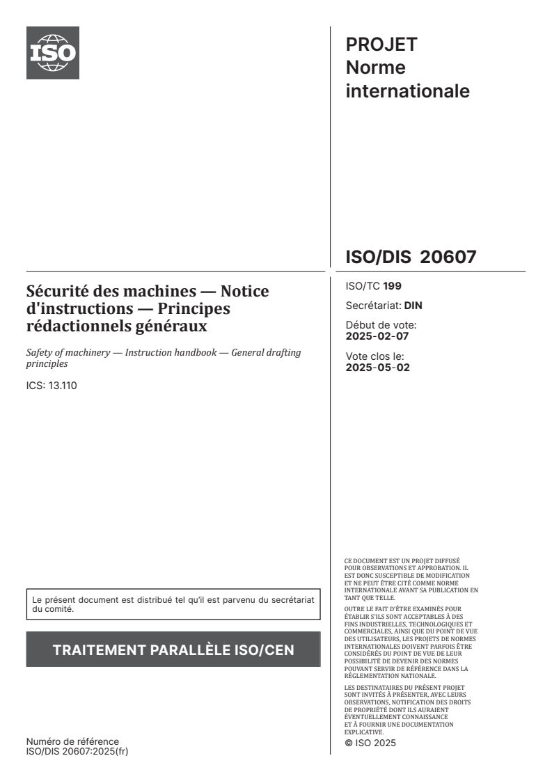 ISO/FDIS 20607 - Sécurité des machines — Notice d'instructions — Principes rédactionnels généraux/15/2025