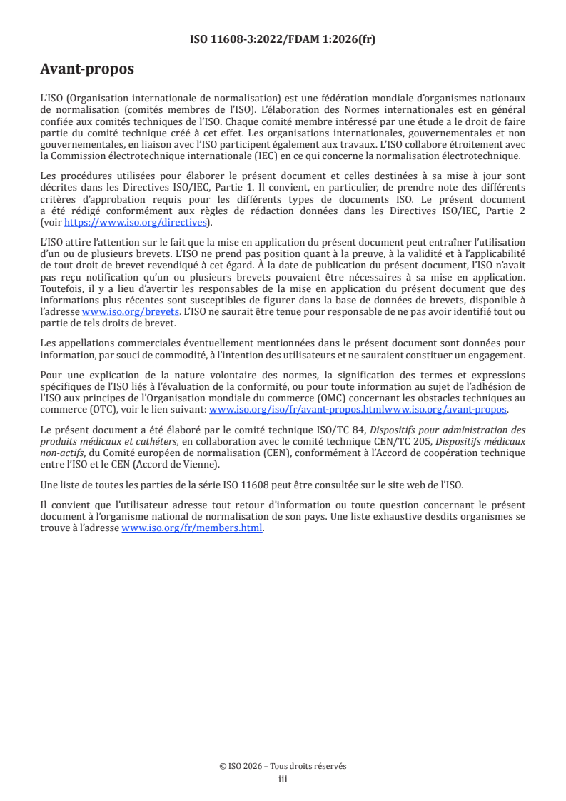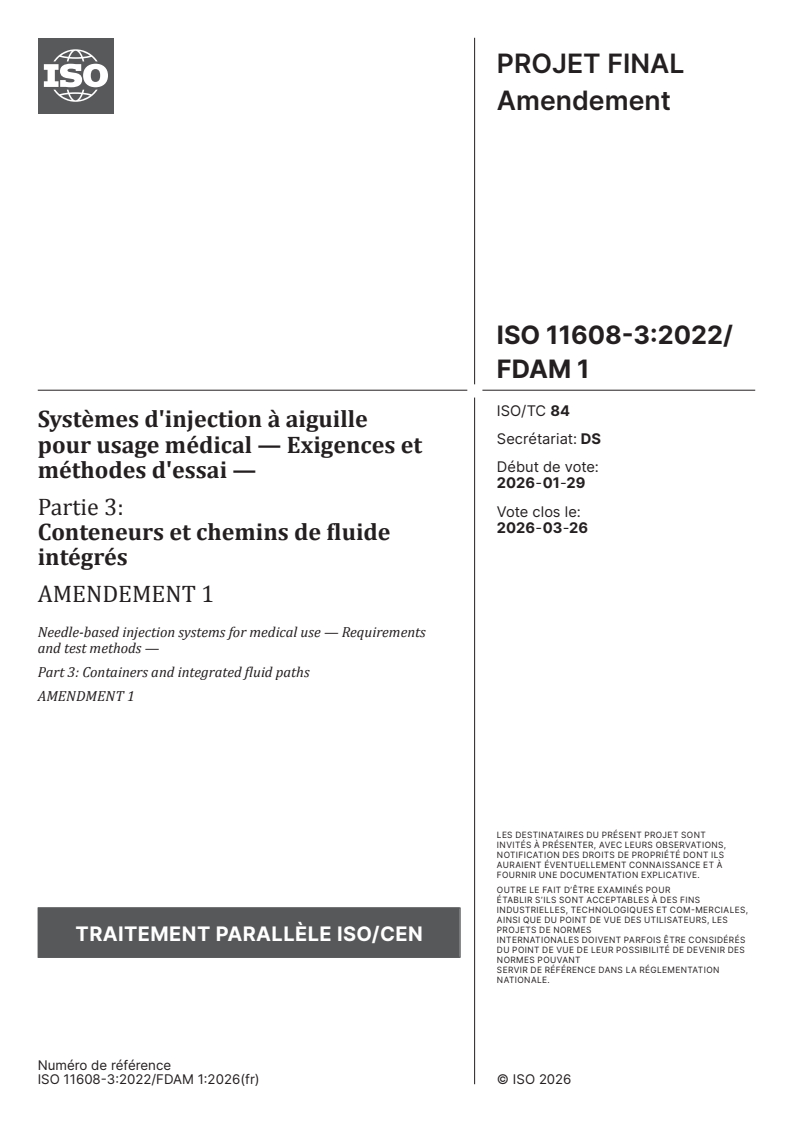 ISO 11608-3:2022/FDAmd 1 - Systèmes d'injection à aiguille pour usage médical — Exigences et méthodes d'essai — Partie 3: Conteneurs et chemins de fluide intégrés — Amendement 1 Released:29. 01. 2026