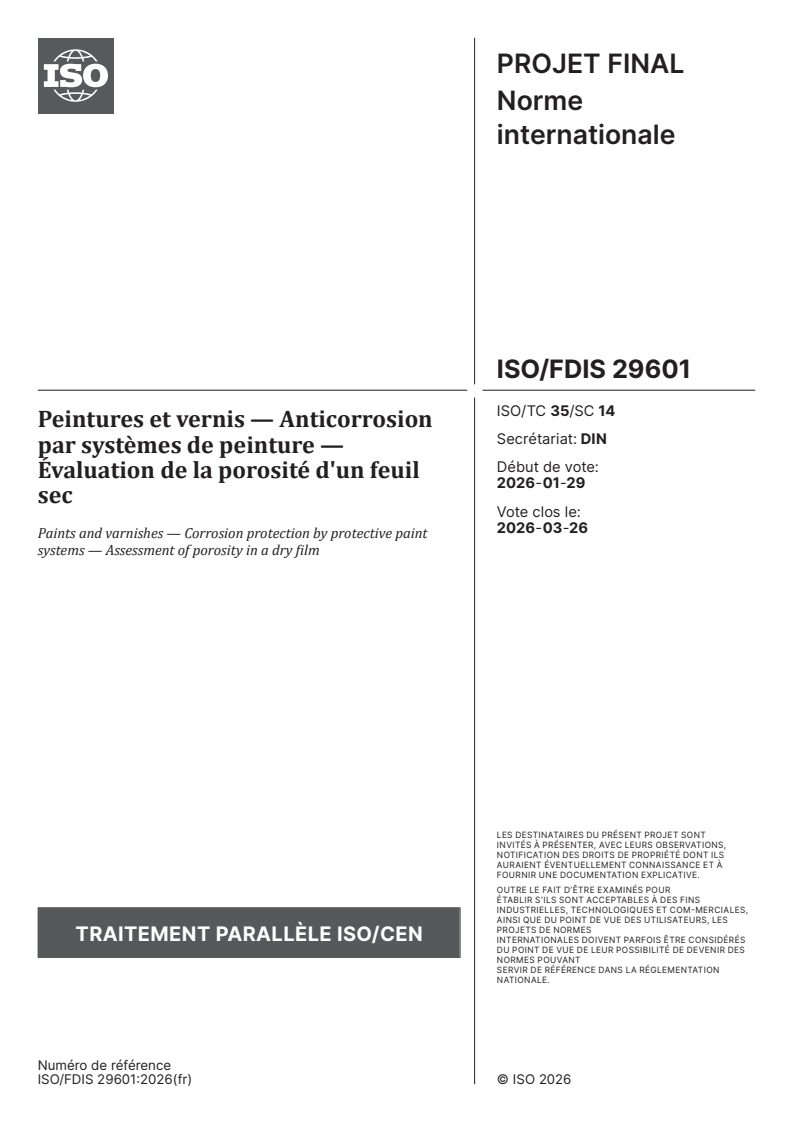 ISO/FDIS 29601 - Peintures et vernis — Anticorrosion par systèmes de peinture — Évaluation de la porosité d'un feuil sec Released:28. 01. 2026