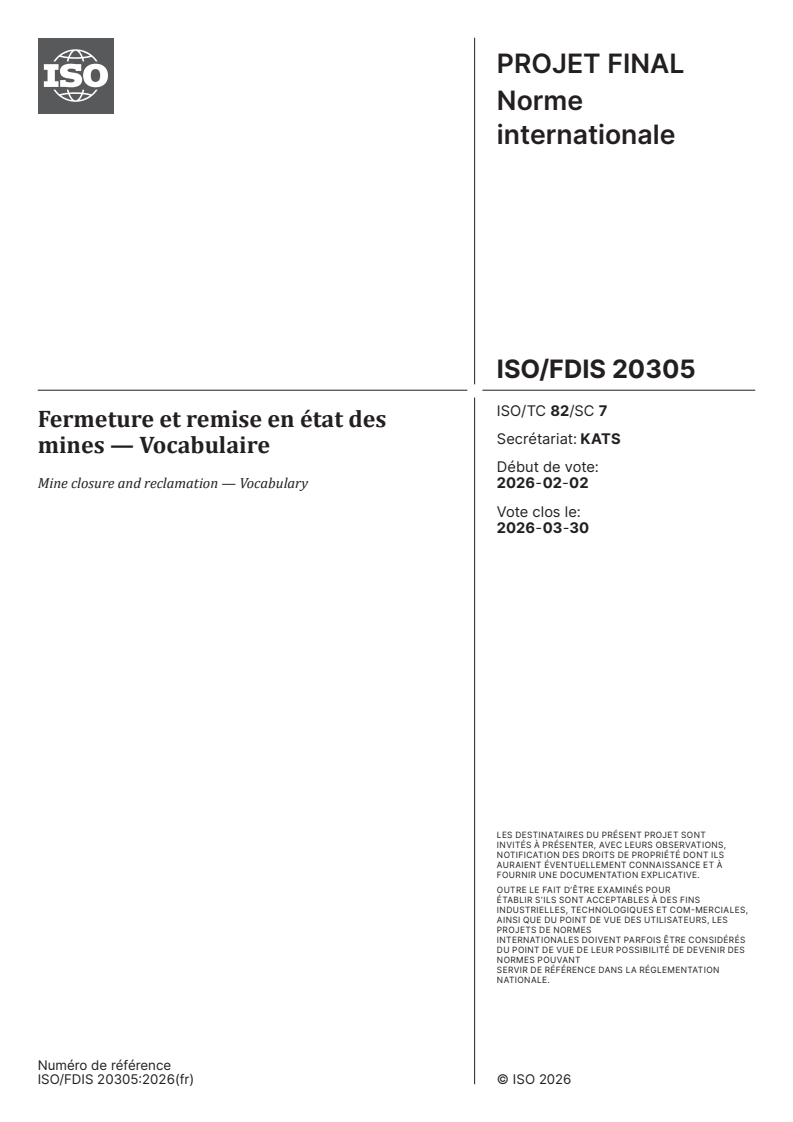ISO/FDIS 20305: Mine closure and reclamation - Vocabulary is an international standard developed by ISO Technical Committee 82, Subcommittee 7 on Sustainable mining and mine closure. This standard provides a clear, consistent vocabulary for mine closure and reclamation management, supporting effective communication and harmonized practices among mining professionals, regulators, consultants, and stakeholders around the globe. The document addresses key terms related to mine closure processes, post-mining land use, management of closure risks, legal obligations, cost considerations, and more.