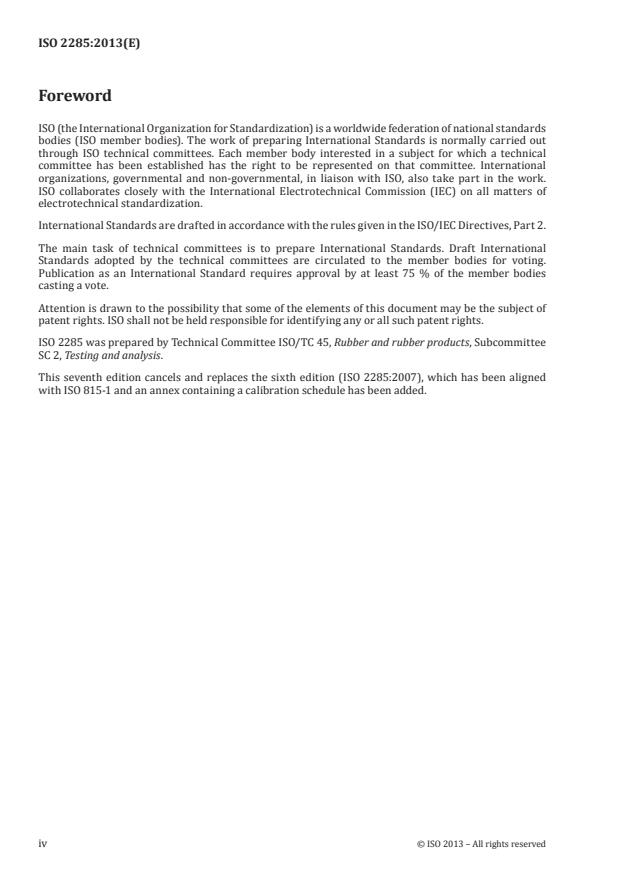 ISO 2285:2013 is a standard published by the International Organization for Standardization (ISO). Its full title is "Rubber, vulcanized or thermoplastic — Determination of tension set under constant elongation, and of tension set, elongation and creep under constant tensile load". This standard covers: ISO 2285:2013 specifies a number of methods of determining the dimensional changes in test pieces of vulcanized or thermoplastic rubber during and after tensile loading for relatively short periods under constant elongation or constant loading. The constant-elongation test is intended to measure the ability of rubbers to retain their elastic properties after extension, at a standard laboratory temperature, to a specified strain which is maintained for a specified time at the same or at a specified higher temperature and then released at the test temperature or at the standard laboratory temperature. The constant-load test specifies a method for the determination of elongation, creep and tension set of rubbers subjected to a constant load at standard laboratory temperature. The test methods are intended to measure the elastic properties of rubber in the hardness range 20 IRHD to 94 IRHD. The creep measurement is not recommended for product design or the evaluation of low-creep materials. For these, reference should be made to ISO 8013.