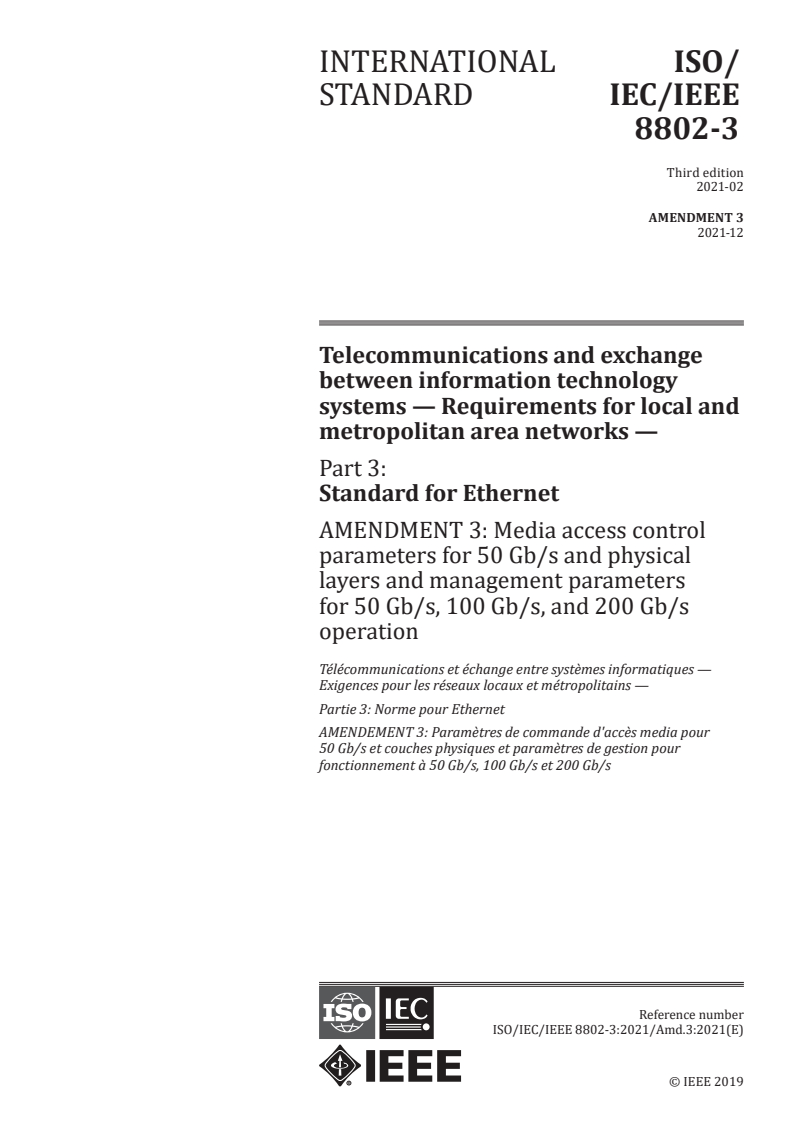 ISO/IEC/IEEE 8802-3:2021/Amd 3:2021 is an amendment to the Ethernet standard (IEEE 802.3 family) that adds Media Access Control (MAC) parameters, Physical Layer (PHY) specifications, and management parameters for high‑speed Ethernet operation at 50 Gb/s, 100 Gb/s, and 200 Gb/s. Adopted into the ISO/IEC/IEEE 8802‑3 series, this amendment aligns IEEE Std 802.3cd features (and related updates) with international standardization, expanding support for new 50G, 100G, and 200G physical interfaces and management models.