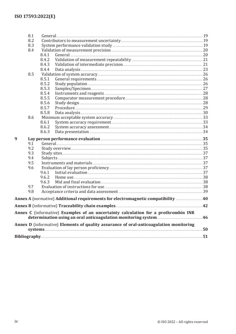 ISO 17593:2022 is a standard published by the International Organization for Standardization (ISO). Its full title is "Clinical laboratory testing and in vitro medical devices - Requirements for in vitro monitoring systems for self-testing of oral anticoagulant therapy". This standard covers: This document specifies requirements for in vitro measuring systems for self-monitoring of vitamin-K antagonist oral anticoagulation therapy, including performance, quality assurance and user training and procedures for the validation of performance by the intended users under actual and simulated conditions of use. This document applies solely to prothrombin time measuring systems used by lay persons for monitoring their own vitamin-K antagonist oral anticoagulation therapy, and which report results as international normalized ratios (INR). This document is applicable to manufacturers of such systems and those other organizations (e.g. regulatory authorities and conformity assessment bodies) having the responsibility for assessing the performance of these systems. This document is not applicable to: - in vitro measuring systems for coagulation quantities assessing vitamin-K antagonist oral anticoagulation therapy used by physicians or healthcare providers; - non-vitamin-K antagonist oral anticoagulation therapy (e.g. dabigatran); - a comprehensive evaluation of all possible factors that can affect the performance of these systems; - the medical aspects of oral-anticoagulation therapy.