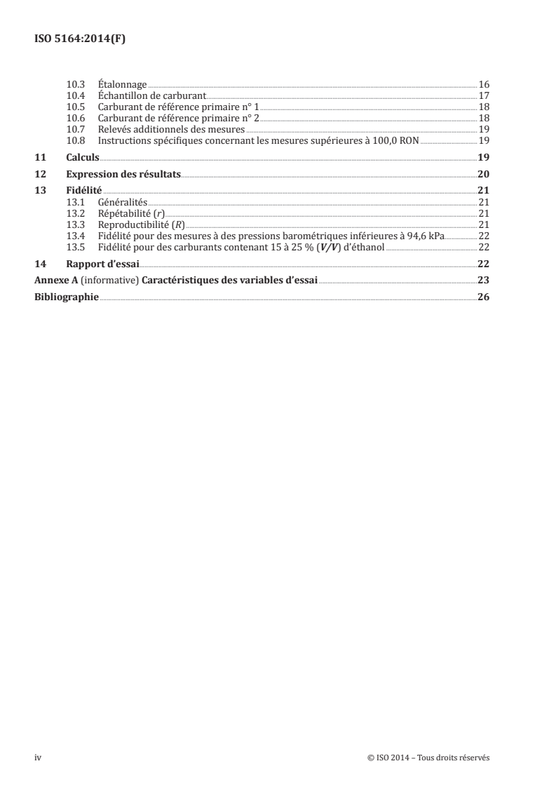 L'ISO 5164:2014 spécifie une méthode de cotation des carburants liquides pour moteurs à allumage commandé, exprimée sur une échelle arbitraire d'indice d'octane, en utilisant un moteur monocylindre à quatre temps, à taux de compression variable, à carburateur, le moteur CFR fonctionnant à vitesse constante. L'indice d'octane recherche (RON) constitue une mesure des caractéristiques antidétonantes des carburants dans les moteurs pour automobiles dans des conditions de fonctionnement peu sévères. L'ISO 5164:2014 s'applique dans une gamme d'indices d'octane allant de 0 RON à 120 RON, mais les essais courants se font entre 40 RON et 120 RON. La gamme de mesure classique pour les carburants moteurs va de 88 RON à 101 RON. L'ISO 5164:2014 est applicable aux carburants qui comportent des oxygénés et contiennent au maximum 4,0 % (m/m) d'oxygène et aux essences contenant jusqu'à 25 % (V/V) d'éthanol.