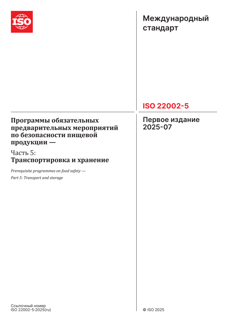 ISO 22002-5:2025 - Prerequisite programmes on food safety — Part 5: Transport and storage Released:7/29/2025