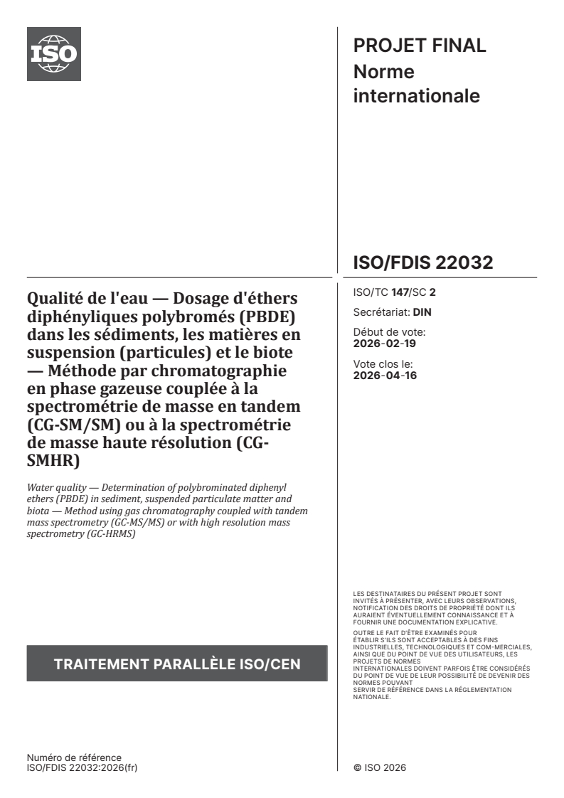 ISO/FDIS 22032 - Water quality — Determination of polybrominated diphenyl ethers (PBDE) in sediment, suspended particulate matter and biota — Method using gas chromatography coupled with tandem mass spectrometry (GC-MS/MS) or with high resolution mass spectrometry (GC-HRMS) Released:5. 02. 2026